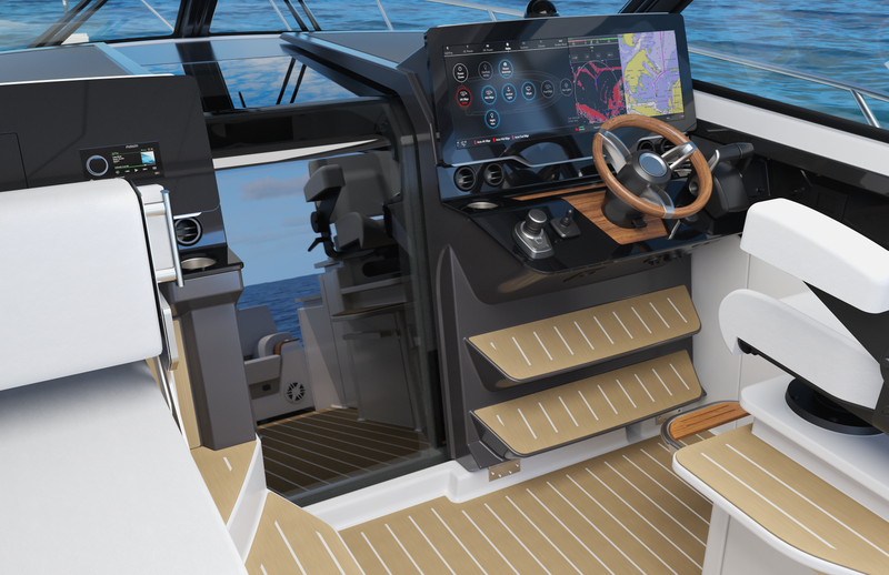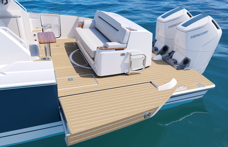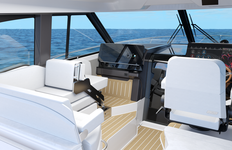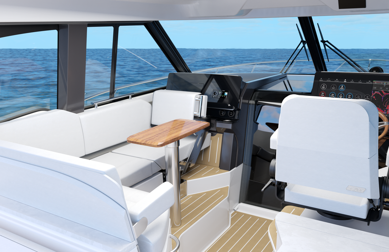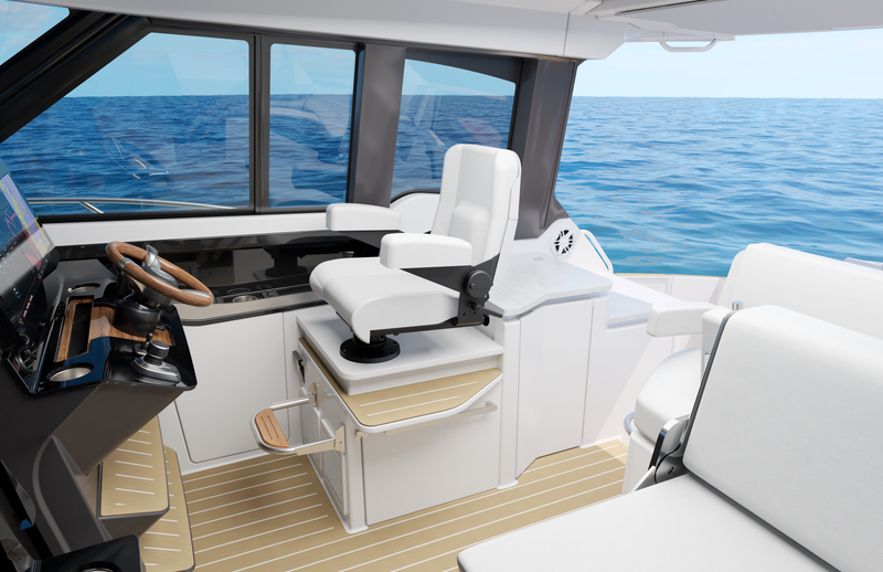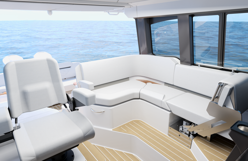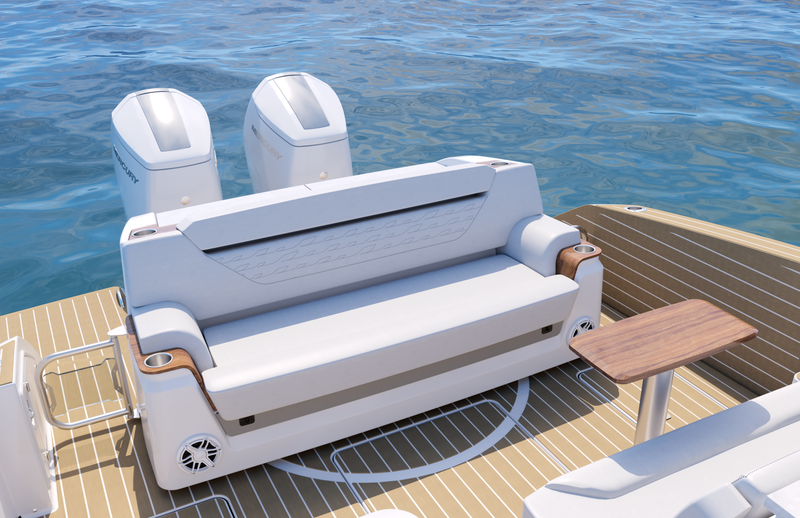 Featuring a salon social zone with versatile seating, the helm seat rotates inward while the companion seat adjusts to form a comfortable L-shaped lounge, ideal for entertaining. The aft cockpit offers a customizable experience, featuring your choice of the Buffet Lounge or the Adventure modules. The aft facing cockpit seat with storage complements either module.